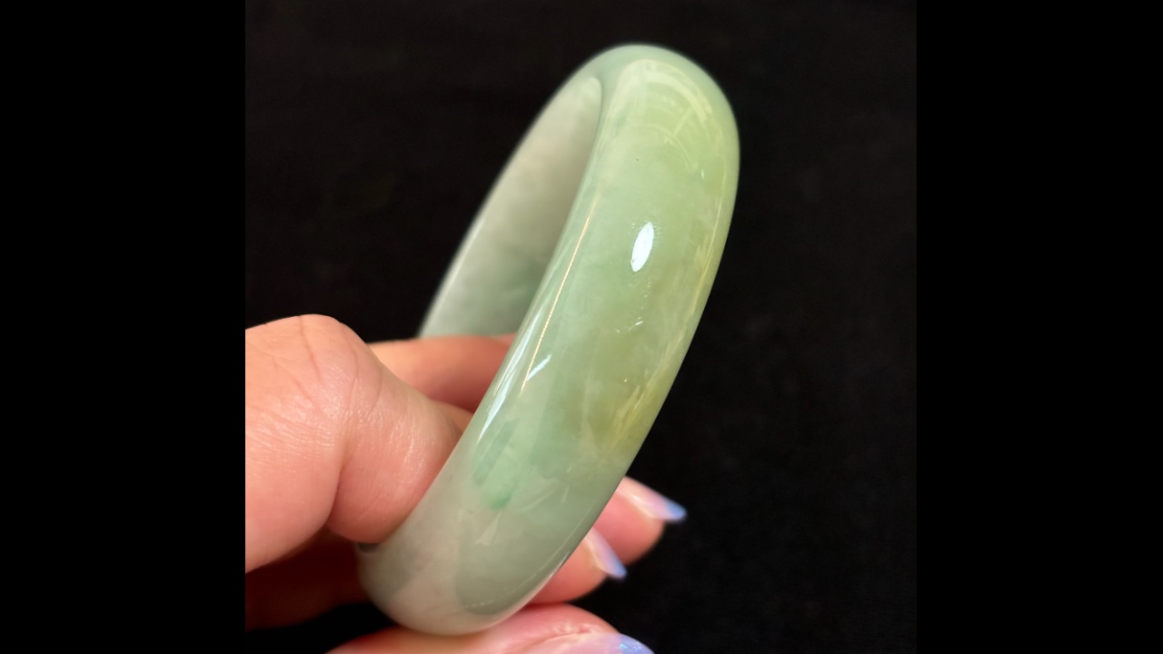 冰感帶淡綠,種水好,很潤。正圈寬版手鐲:約57mm,寬度約16mm