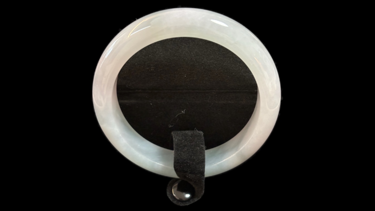 冰感帶春彩,肉質細膩,種水非常好,膠感飽滿,很透,完美無紋裂。圈口約57mm