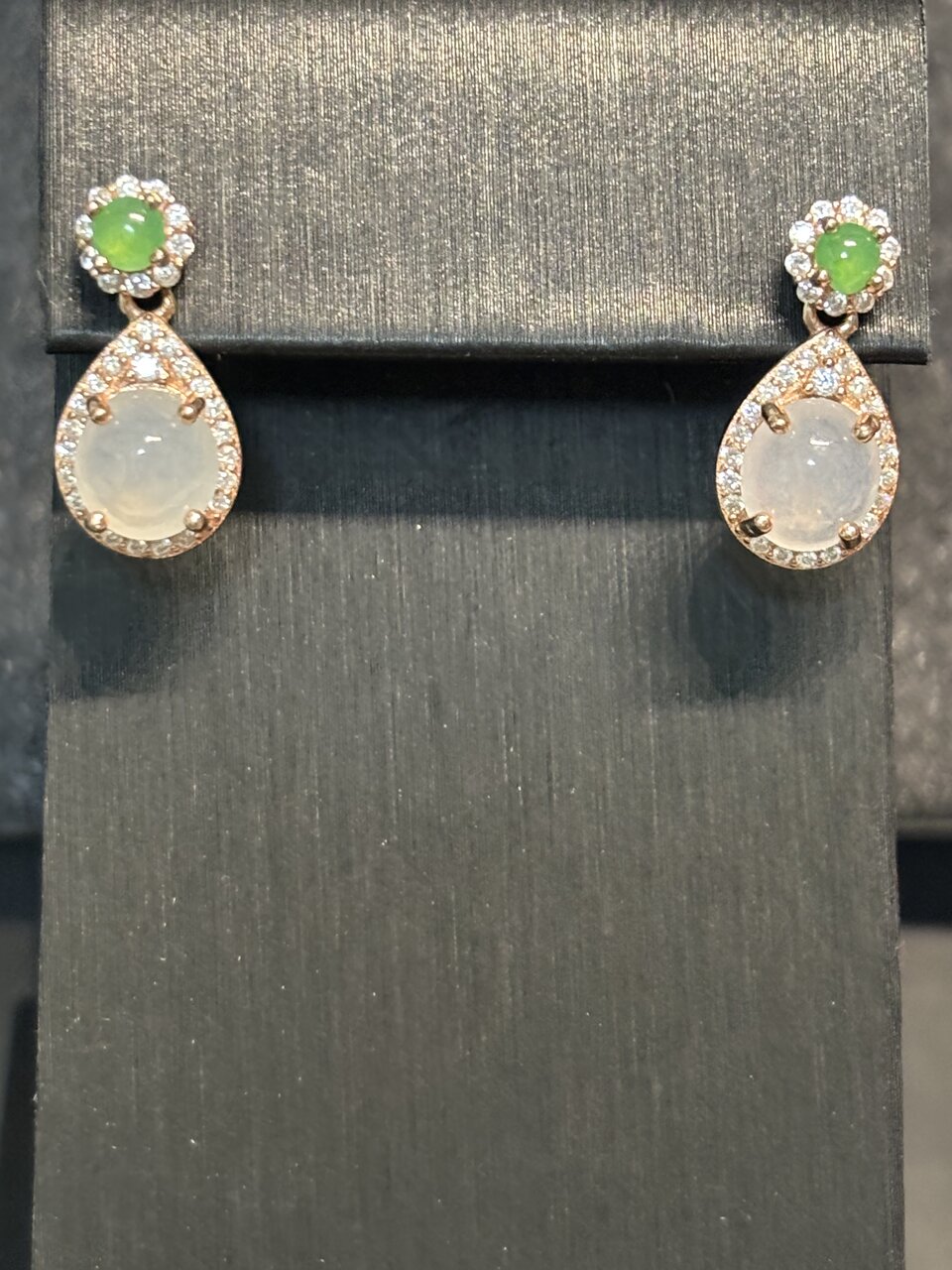 冰種白翡翠蛋面耳環,配綠翡翠,18K玫瑰金鑲鑽,晶瑩剔透