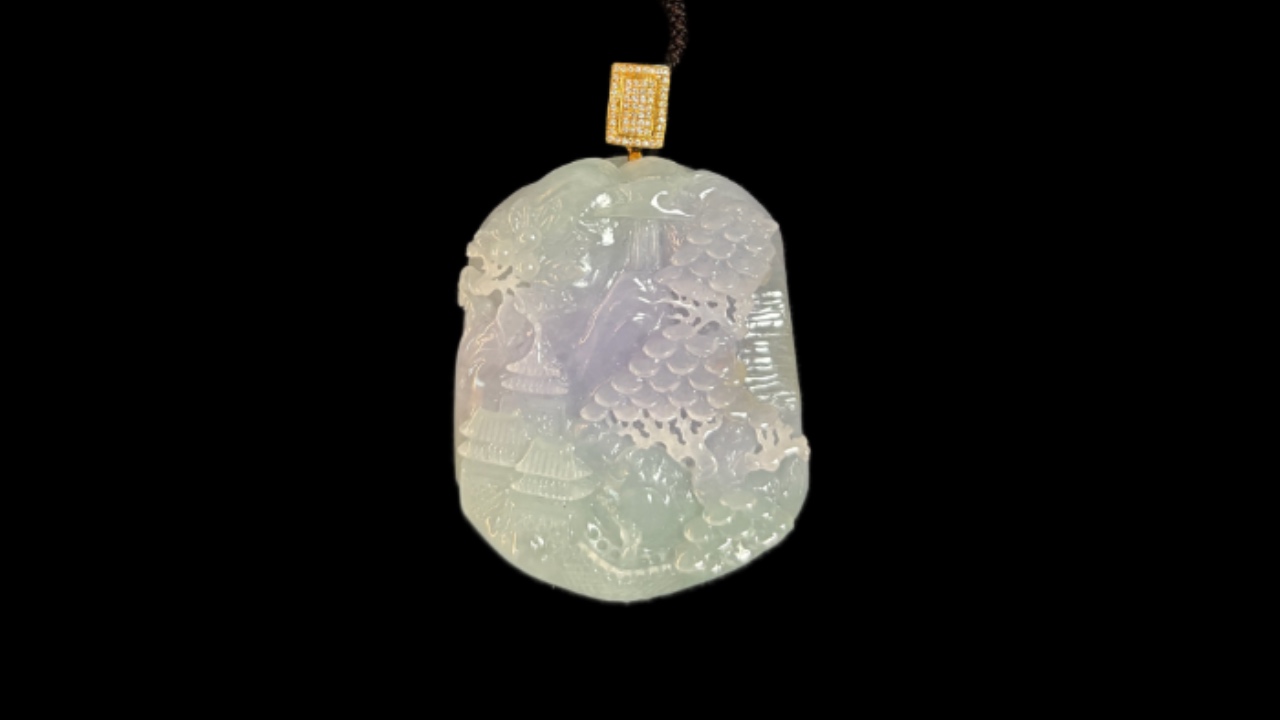 紫羅蘭山水牌+ 18K黃金和鑽。想要發大財必帶山水牌。料子質地細嫩,雕工細緻,中間一截紫,很有意境。翡翠山水牌的㝢意是胸背山河,自由灑脫,備有靠山,怡然自得,財源廣進,蘊含著人們對美好生活的追求和嚮往。