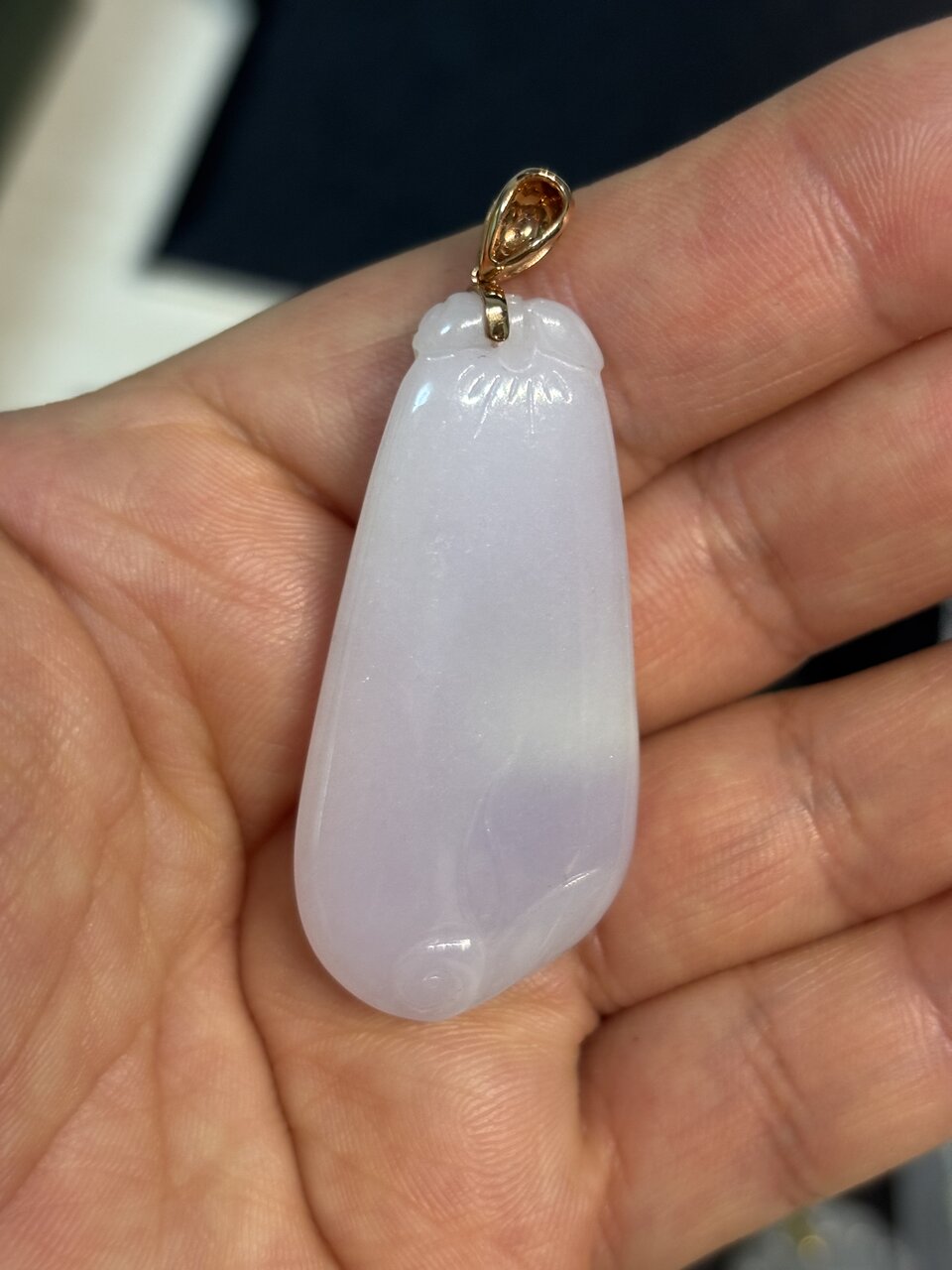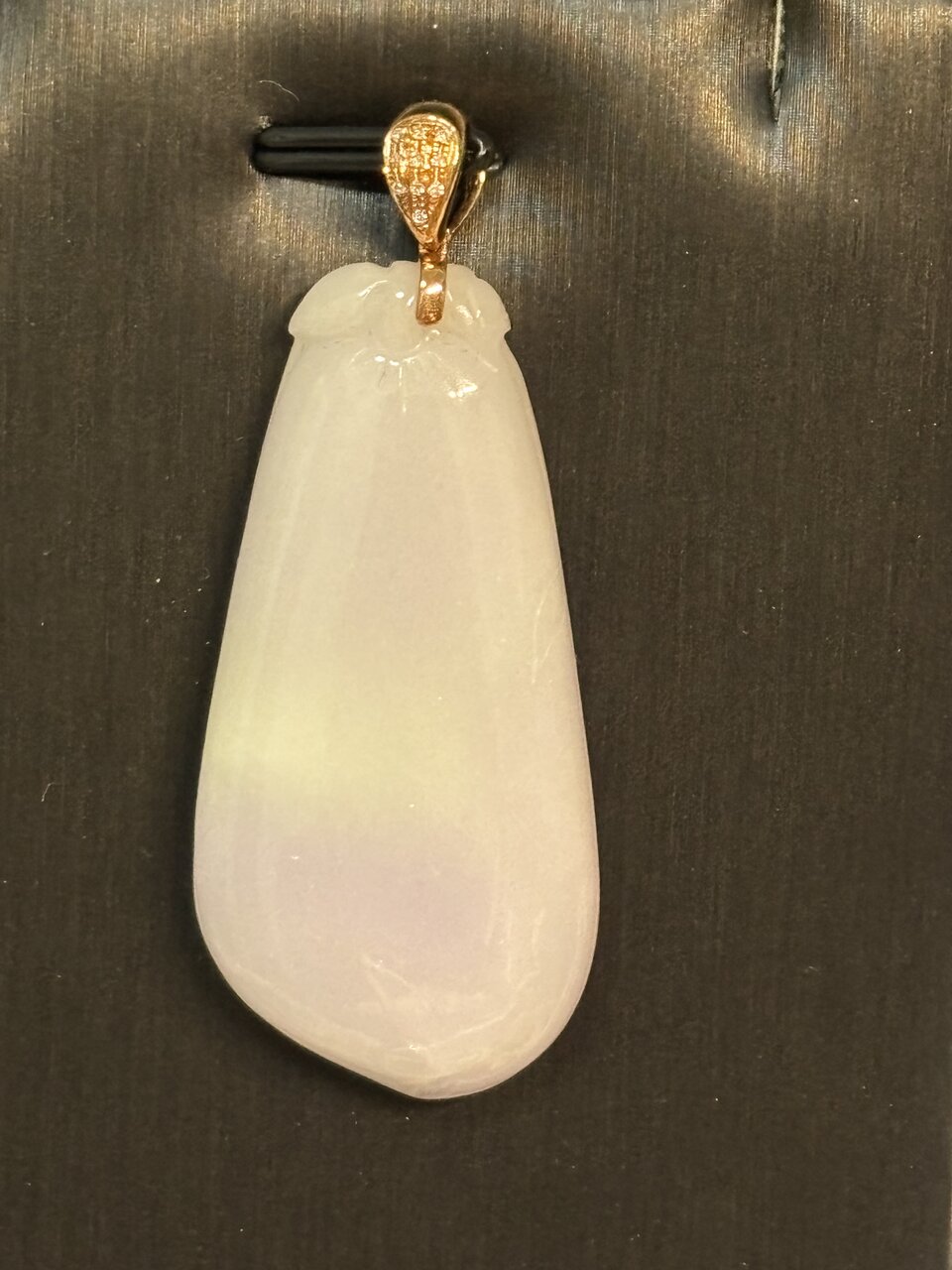 冰種紫羅蘭翡翠福瓜吊墜,質地溫潤,18K金鑲鑽扣頭,高貴典雅
