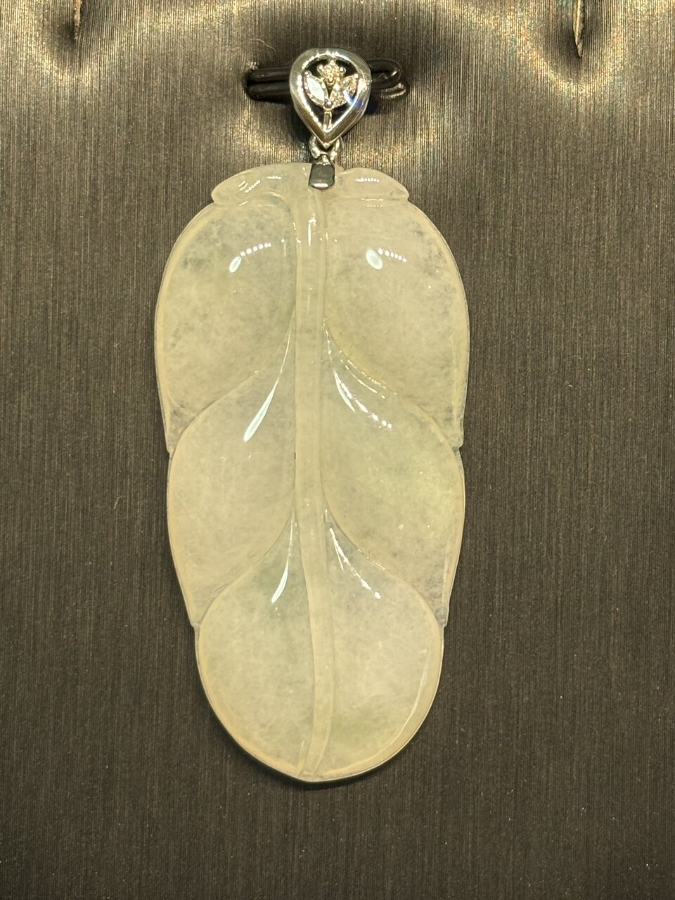 冰種翡翠金枝玉葉吊墜,葉片造型栩栩如生,銀質鑲鑽扣頭